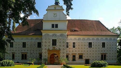 Zámek je výjimečný svou sgrafitovou výzdobou, která se nachází nejen na venkovních zdech, ale též na nádvoří, a dokonce i na komínech. Tato kobercová sgrafita, vytvořená italskými mistry, jsou tak detailní, že zámek z dálky vypadá jako zabalený do krajky.